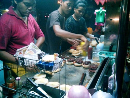 There is a burger stall in Pantai Jerjak, at the corner of the field. It starts the business around 6pm or 7pm in the evening every day, except Wednesday. Wednesday has “pasar malam” there.