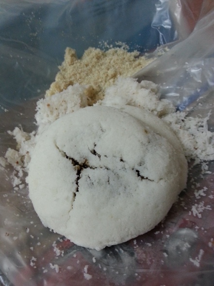 It has been a long time I never eat this. It called Putu Piring. Why? Because the shape is like a piring. Piring is a Malay word means plate. Putu Piring is made from rice flour. It is stuffed with brown sugar inside and eat together with the coconut and sugar.